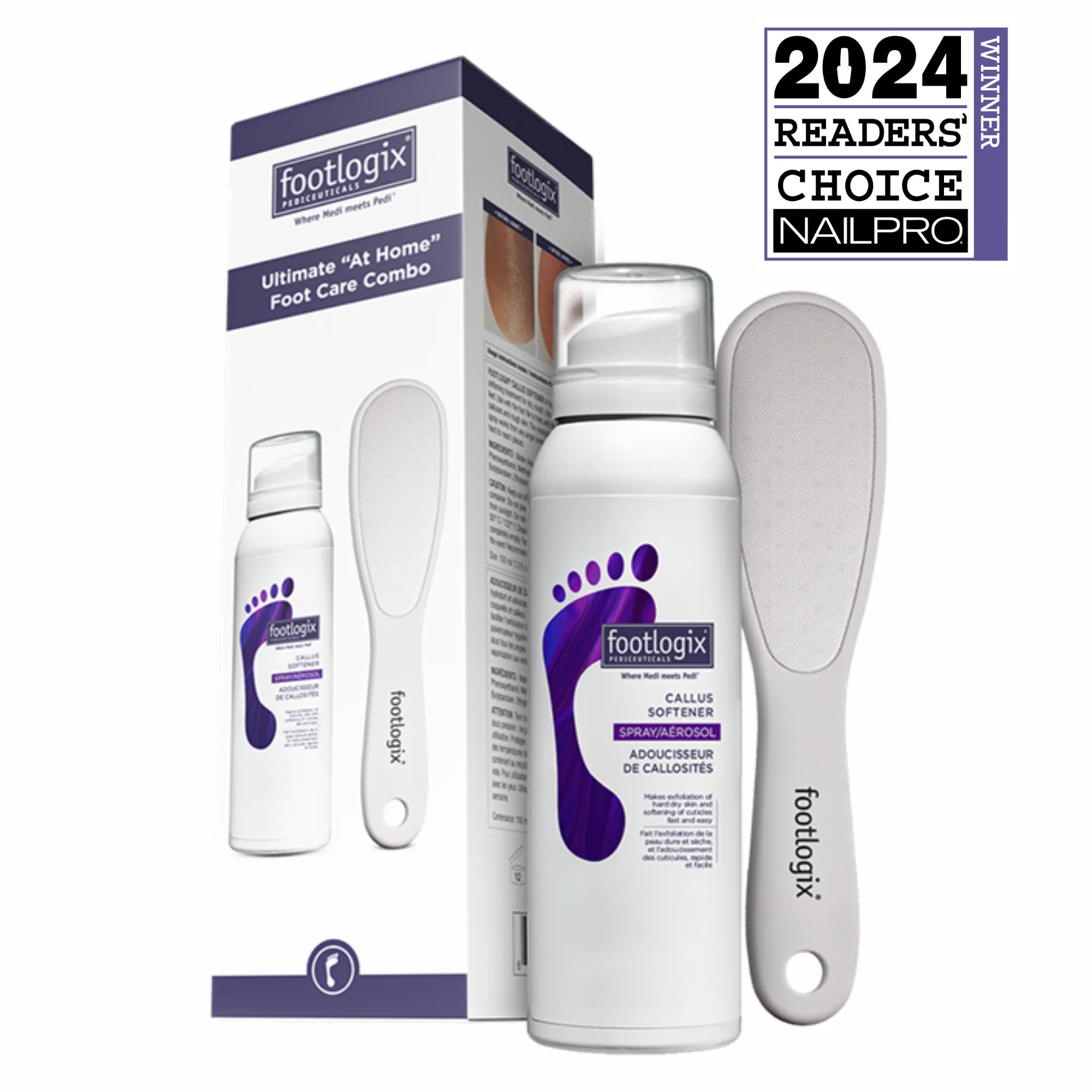 „Footlogix® Callus Softener“ (purškalas): švelnus, bet veiksmingas purškiklis, kuris suminkština sukietėjusią odą ir suragėjusias pėdas, kad jas būtų lengva pašalinti.